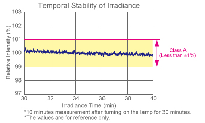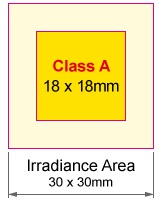 ![]() | 均勻性 在350-1800nm的范圍內(nèi),1太陽的計(jì)算值大約是94.4 mw/cm。 工作距離:大約220毫米可以通過光強(qiáng)度控制來調(diào)節(jié)由燈壽命引起的光強(qiáng)度下降。超過A類區(qū)域的大小是參考值。請注意,燈的輸出因制造批次而異。它需要分別檢查光強(qiáng)度。 |